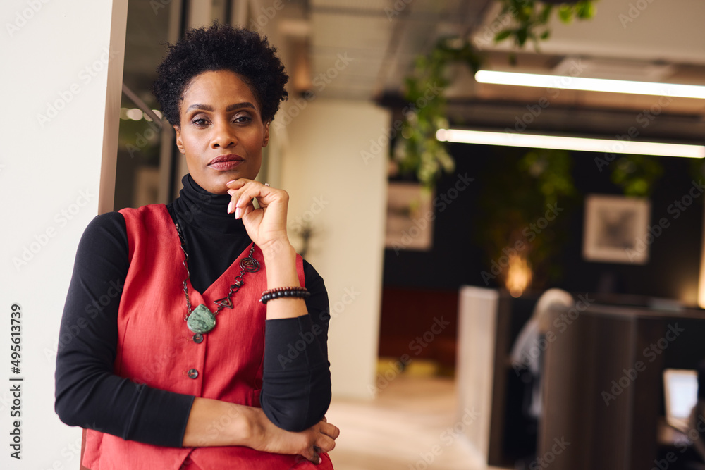 Portrait of mature black woman with hand on chin looking at camera with a pensive expression in coworking space