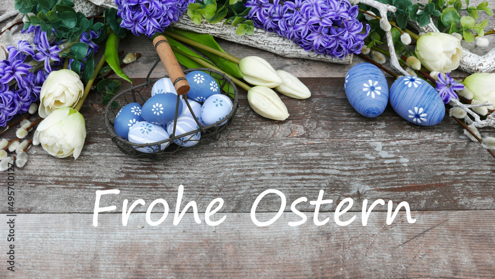 Osterkarte: Osterarrangement auf altem Holz mit dem Text Frohe Ostern.