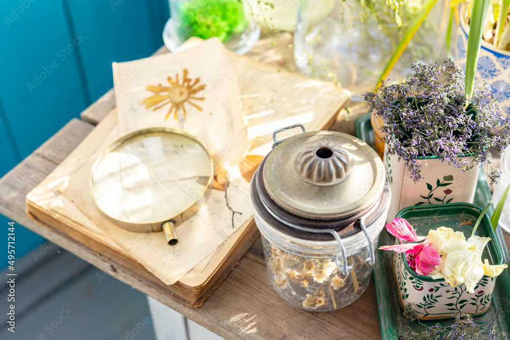 Vintage cupboard on veranda on sunny spring day decorated with flowers, Easter retro decor and willow branches, Easter family celebration