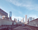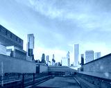 Railroad tracks with Chicago skyline in distance, color toning applied, USA.