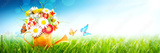 Colorful wild flower bouquet in a watering can. Concept of spring and gardening.