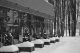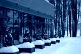 The exterior of a commercial building with large windows in the snowdrifts in winter. The windows reflect the plants planted in front of the building.
