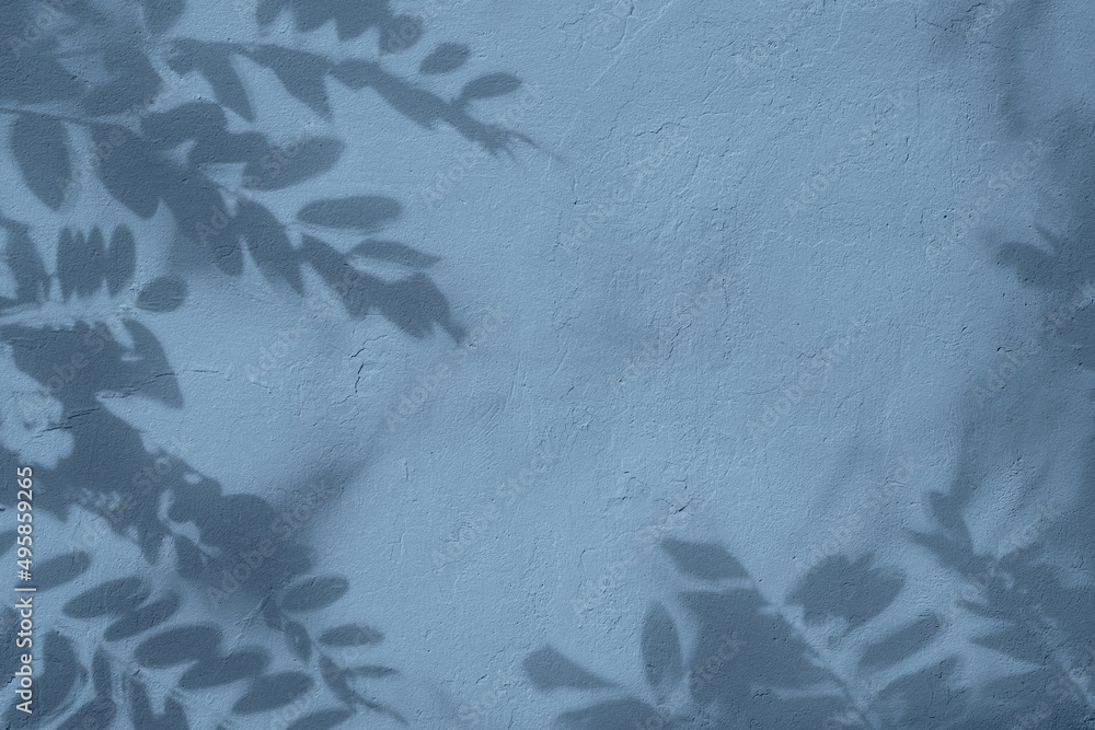 Shadow of leaves on blue concrete wall texture with roughness and irregularities. Abstract trendy colored nature concept background. Copy space for text overlay, poster mockup flat lay