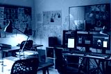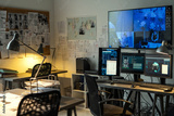 Corner of small office of FBI agency with set of criminal profiles hanging on board and large screen security camera on wall