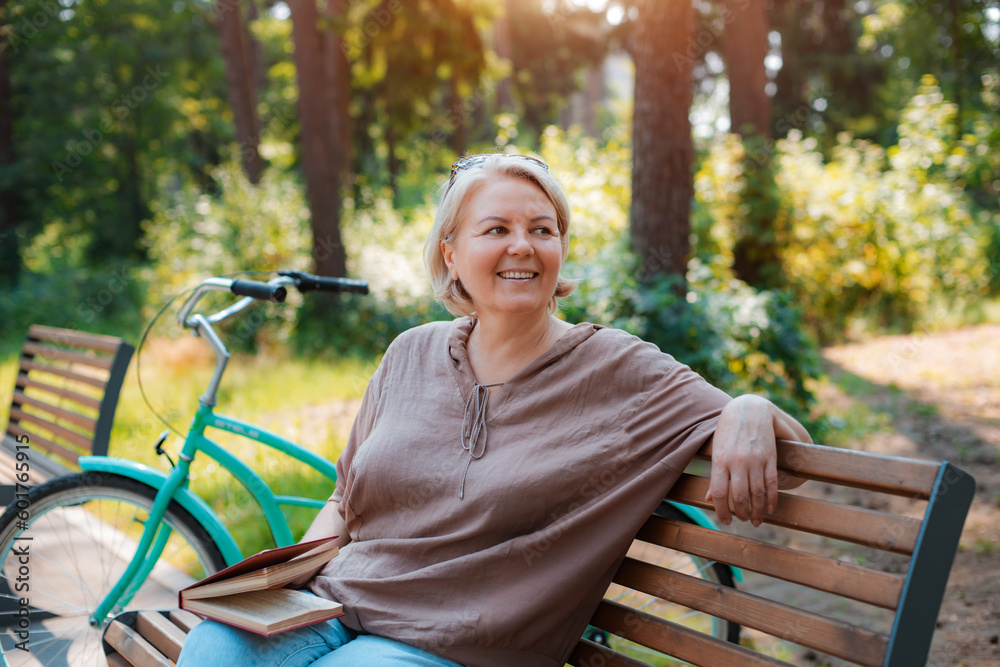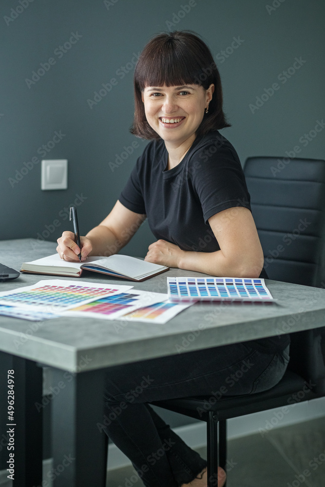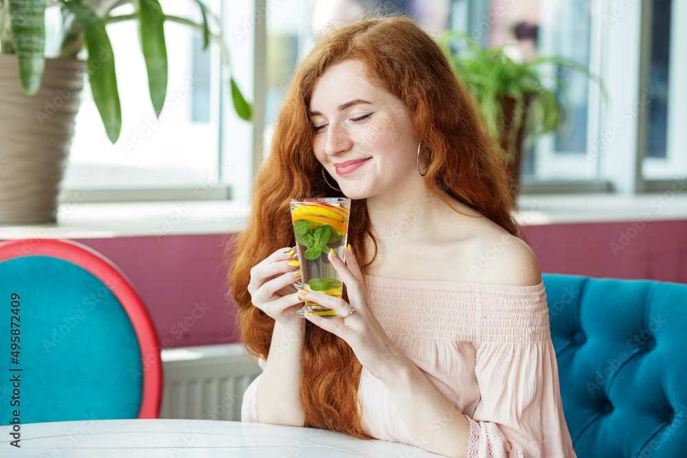 Cute happy girl smiles and sits in cafe. Delicious mocktail drink. Woman with long red curly hair.