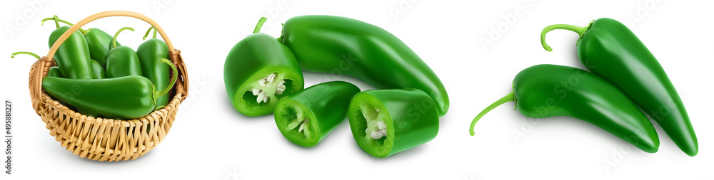 jalapeno peppers isolated on white background. Green chili pepper with clipping path and full depth of field. Set or collection