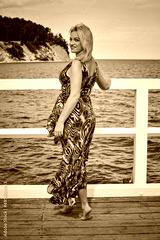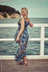 Feminine holiday session in vintage style. Beautiful woman on a wooden pier by the Polish sea in Gdynia.