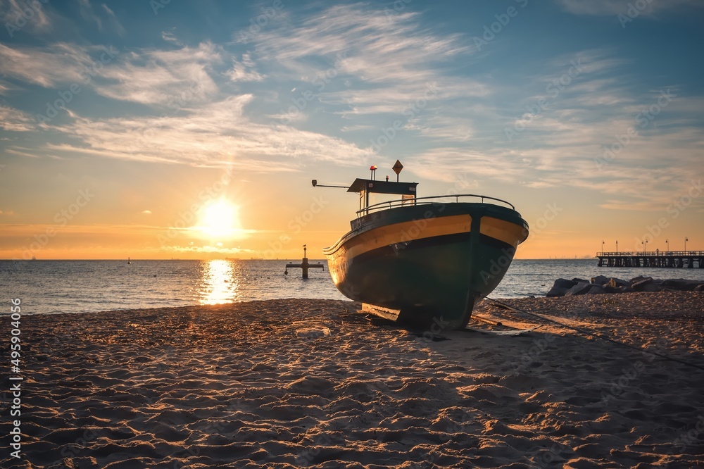 Beautiful morning view at the Polish seaside in Gdynia. Ship on a sandy beach in the morning.