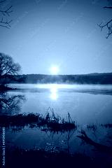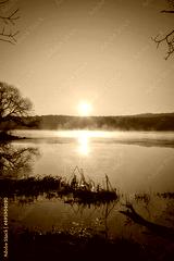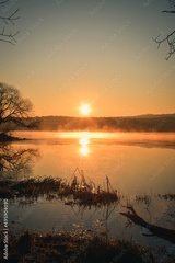 Beautiful morning spring landscape. Sunrise over the lake in Kielce, Poland.