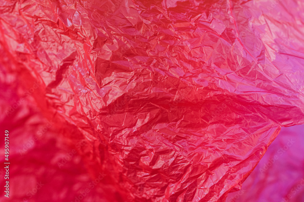 The texture of a crumpled pink package with selective focus, pink abstraction