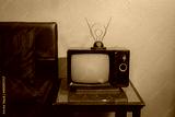 Red retro old TV with antenna on table in the bedroom.