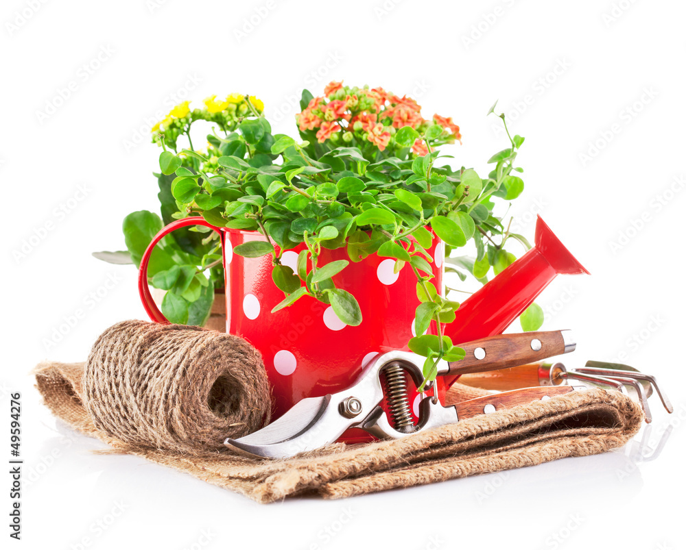 green plant in red watering can with garden tool isolated on