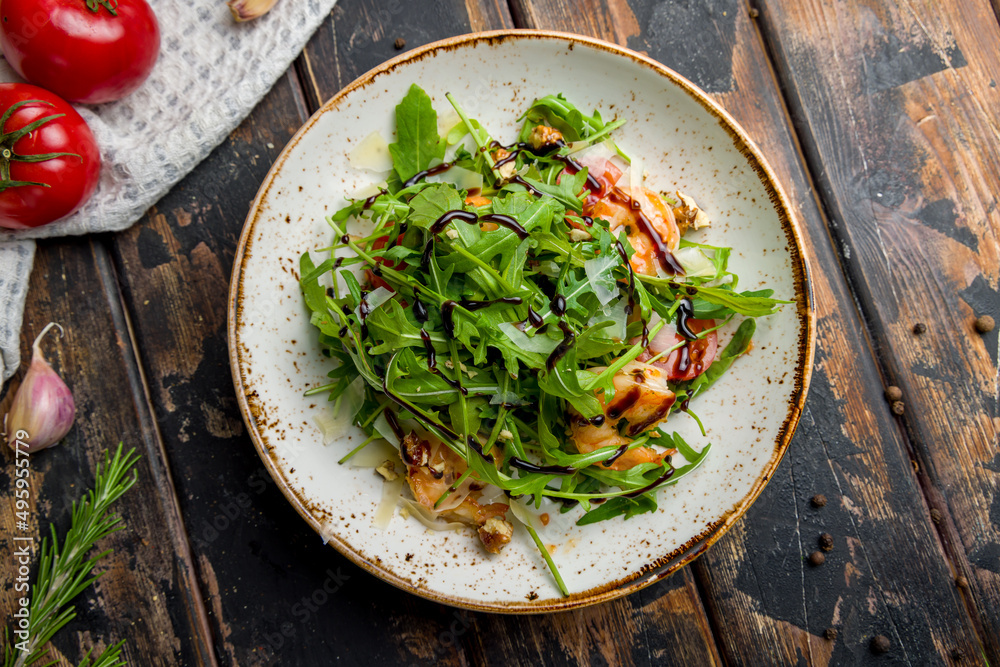 Arugula with shrimps and balsamic sauce on old wooden table top view
