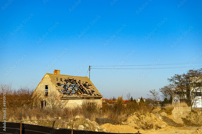 an old dilapidated abandoned house on vacant lot. Private house with a ruined roof