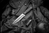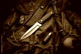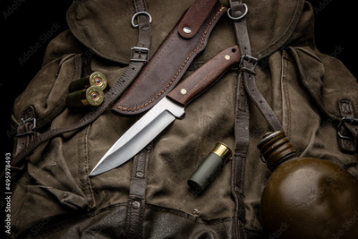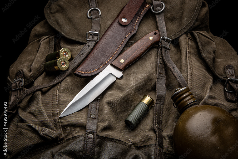 Hunting knife with a wooden handle on a vintage canvas backpack. 12-caliber shotgun shells and a water canteen are nearby. Hunter's set. Dark back.