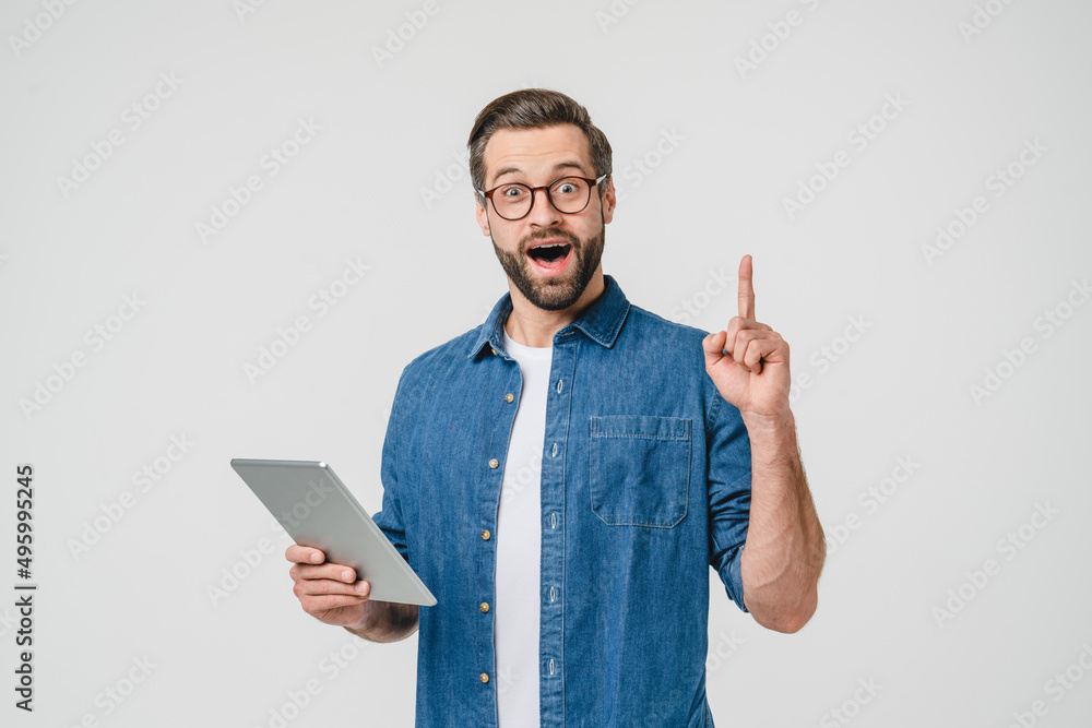 Young happy impressed caucasian man student in glasses using digital tablet for e-learning, watching video, webinars having idea, pointing upwards isolated in white background