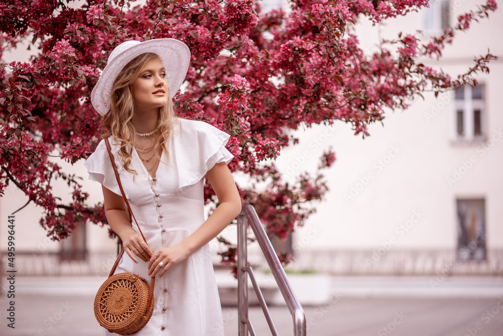 Fashionable elegant woman wearing trendy spring, summer white dress, hat, with small shoulder round wicker bag, posing near blooming trees. Copy, empty space for text