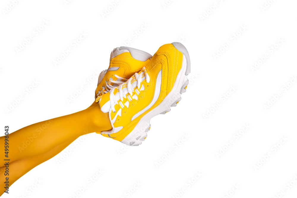 New Yellow female sneakers on long slender woman legs in yellow tights isolated on white background. Banner with copy space.