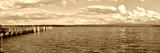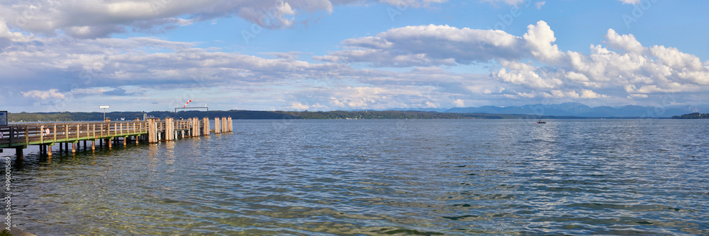 Beautiful lake panorama with pier in Upper Bavaria, Germany. On the Ammersee.