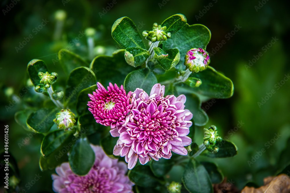 Beautiful tiny pink mums surrounded by blurred green - pollen scattered on flowers and leaves - Selective focus and copyspace