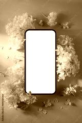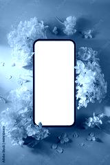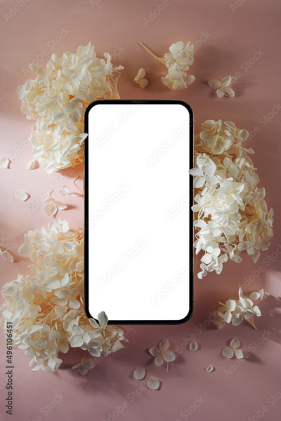 Smartphone mockup with white flowers on pink background. Device screen mock up on stylish background for presentation or appl design