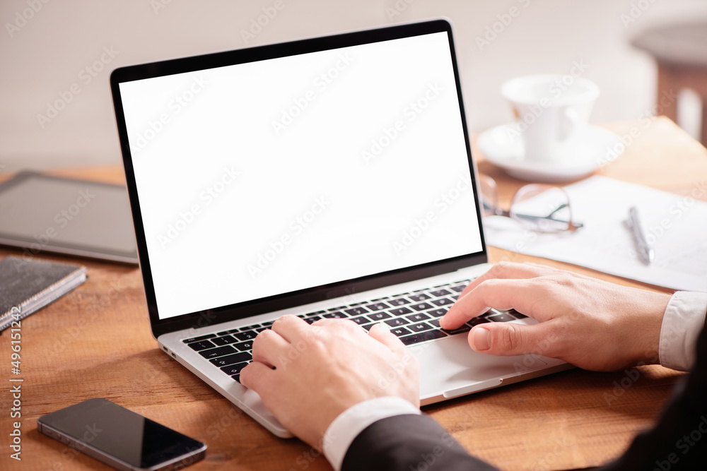Cropped photo of young businessman using laptop on wooden table