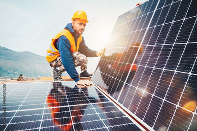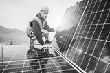Workers assemble energy system with solar panel for electricity