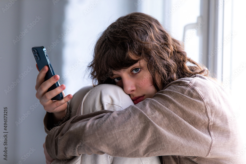Portrait of a curly girl using a smartphone while sitting by the window.