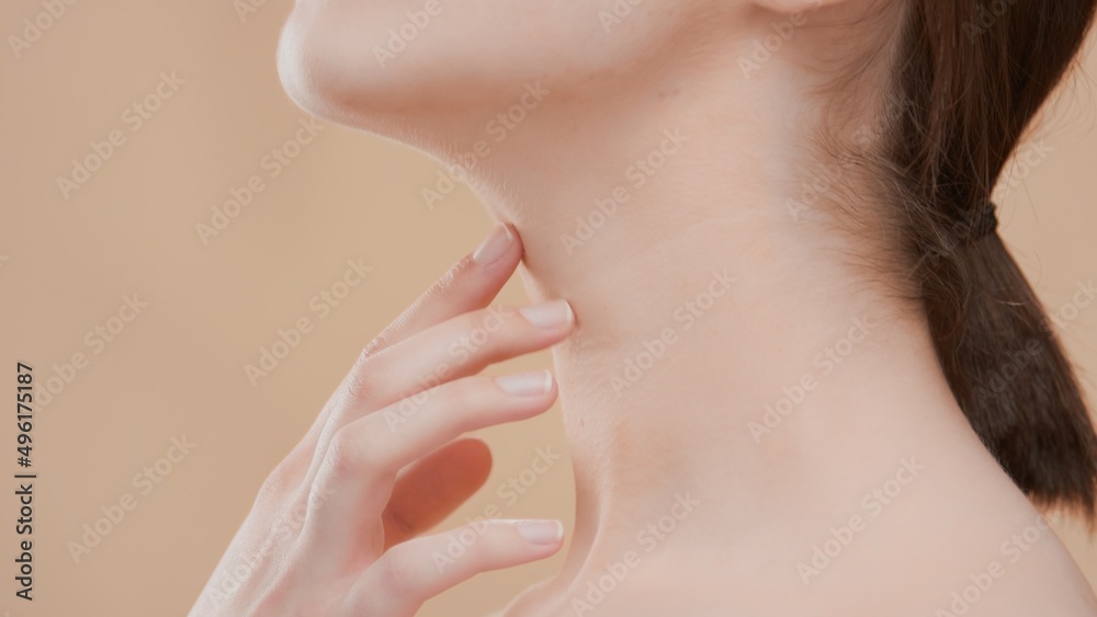 Extreme close-up shot of young Caucasian woman touches her neck with her fingers on beige background | Beauty care commercial concept