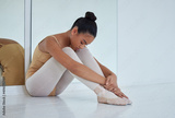 Heavily weighted and uninspired. Shot of a young ballet dancer looking stressed while sitting on the floor.