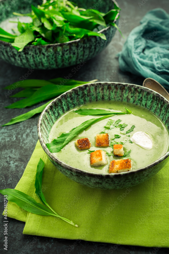 Homade bear leek soup or ramson soup with crouton and sour cream