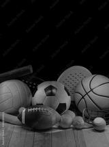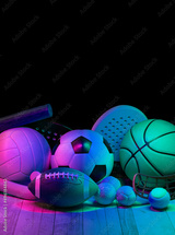 Sports equipment, rackets and balls on hardwood court floor with neon light background. Vertical education and sport poster, greeting cards, headers, website.
