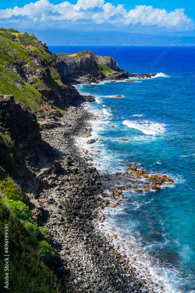 Aerial view of the cliffs of Lipoa Ridge above the Pacific Ocean along the Honoapiilani Highway in West Maui, Hawaii, United States