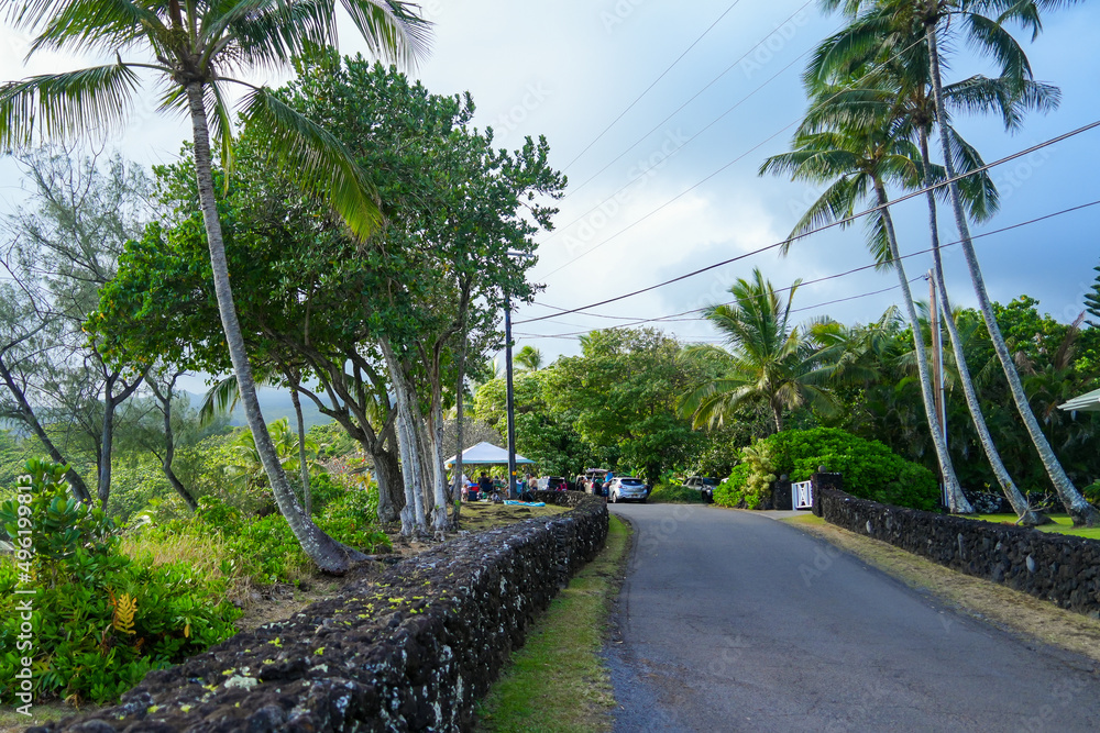 Paved road surrounded with palm trees and lava rock walls in Koki Beach Park on the Road to Hana in the East of Maui island in Hawaii, United States