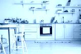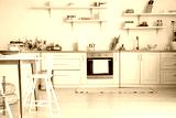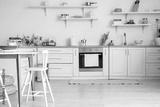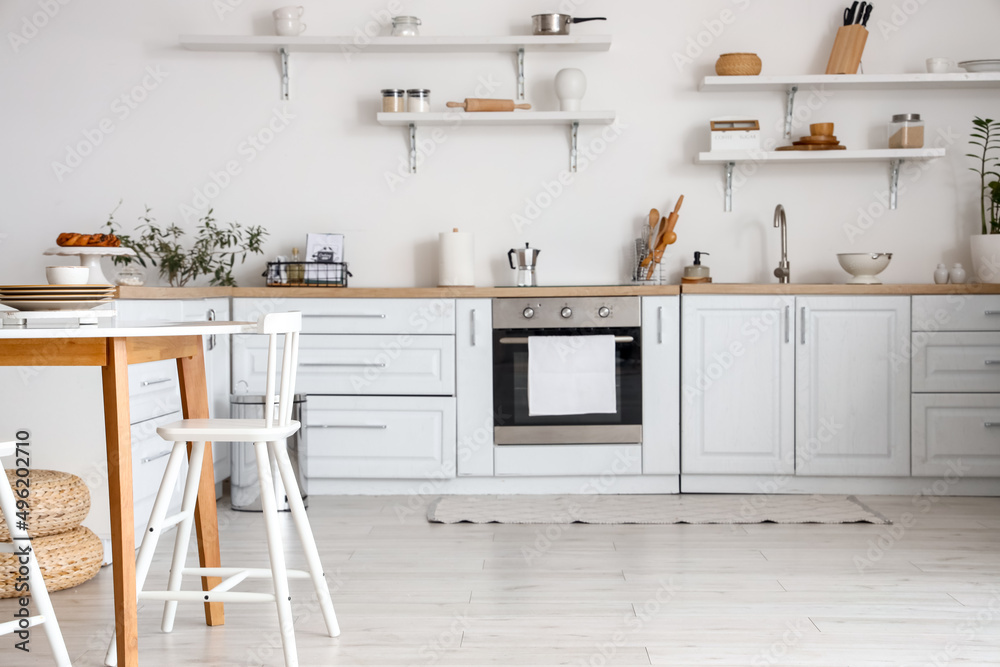 Interior of stylish kitchen with shelves and dining table