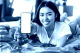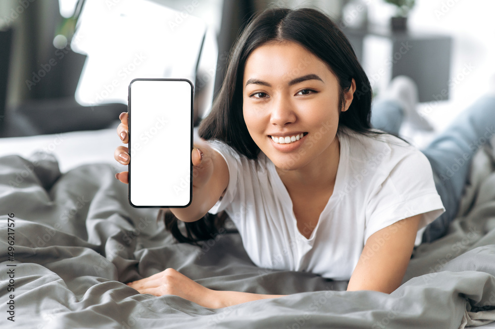 Mock-up concept. Asian beautiful young brunette woman in casual clothes lies on the bed, shows the smartphone with a blank white mock-up screen, looks at the camera, smiling