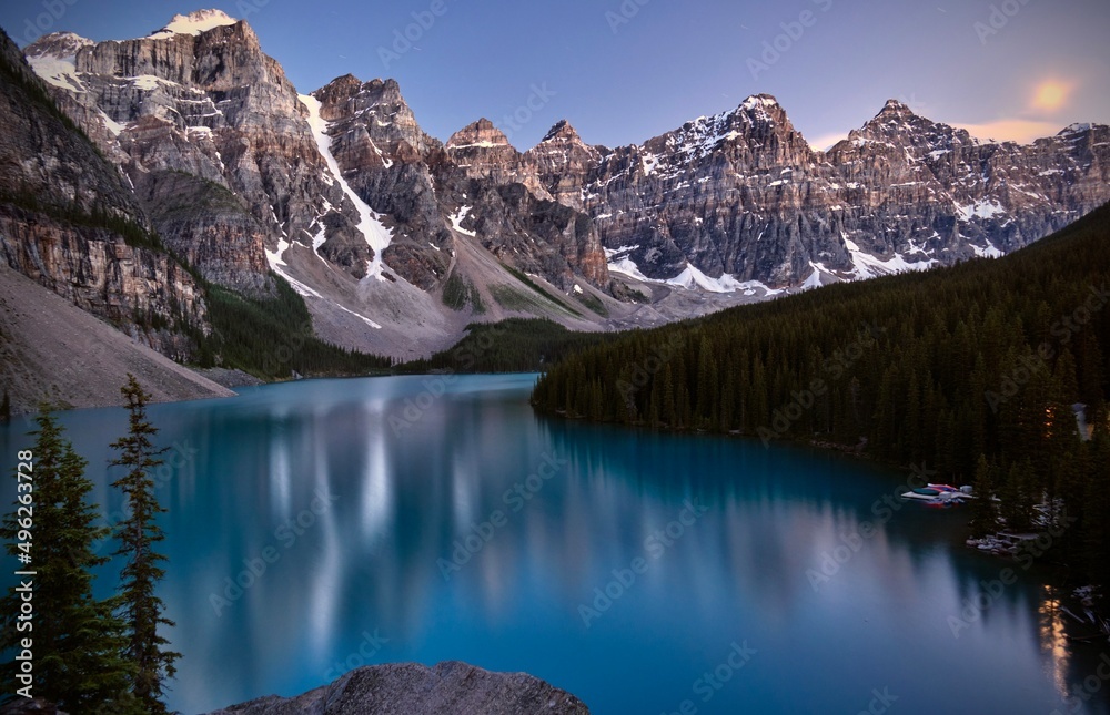 Turquise glacial lake by rocky mountains at night. Morain lake Ten peaks at nigh. Alberta. Canada