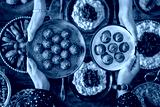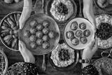 Family dinner with many foods on the table and dessert at the hands of two woman