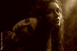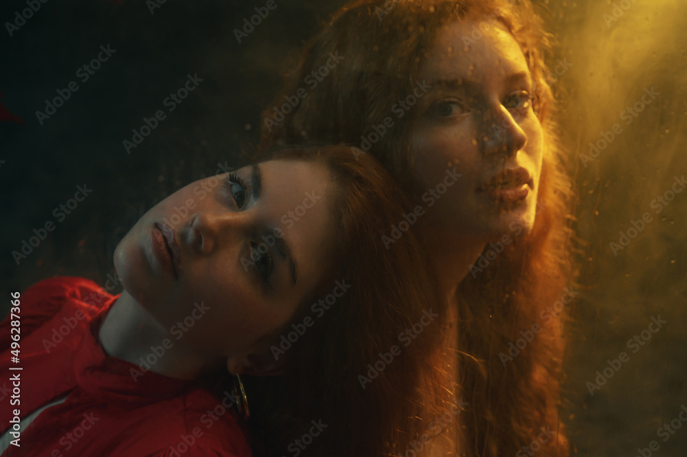 Two beautiful redhead freckled women with long natural curly hair posing in smoke, darkness and warm light. Art studio portrait made through the wet glass. Film grain effect