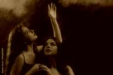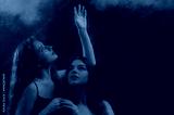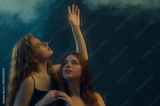 Two beautiful redhead freckled women with long natural curly hair posing in smoke, darkness, warm and cool blue light. Art studio portrait. Film grain effect