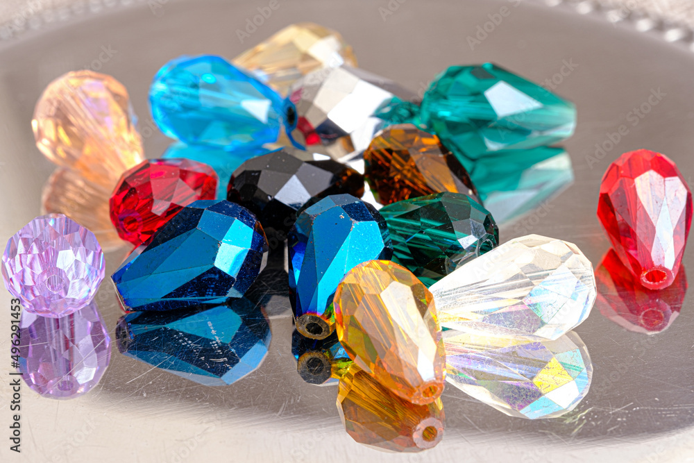 Colorful crystal stones heap on grey background, closeup shot of lapis lazuli energy stones.