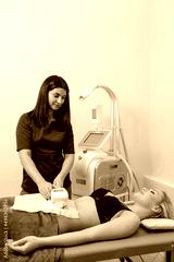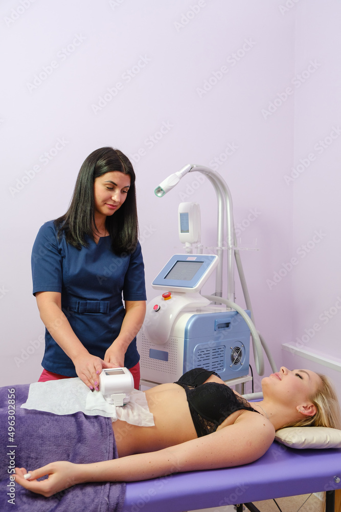 Beautiful woman undergoing procedure of anti-cellulite massage in beauty salon.