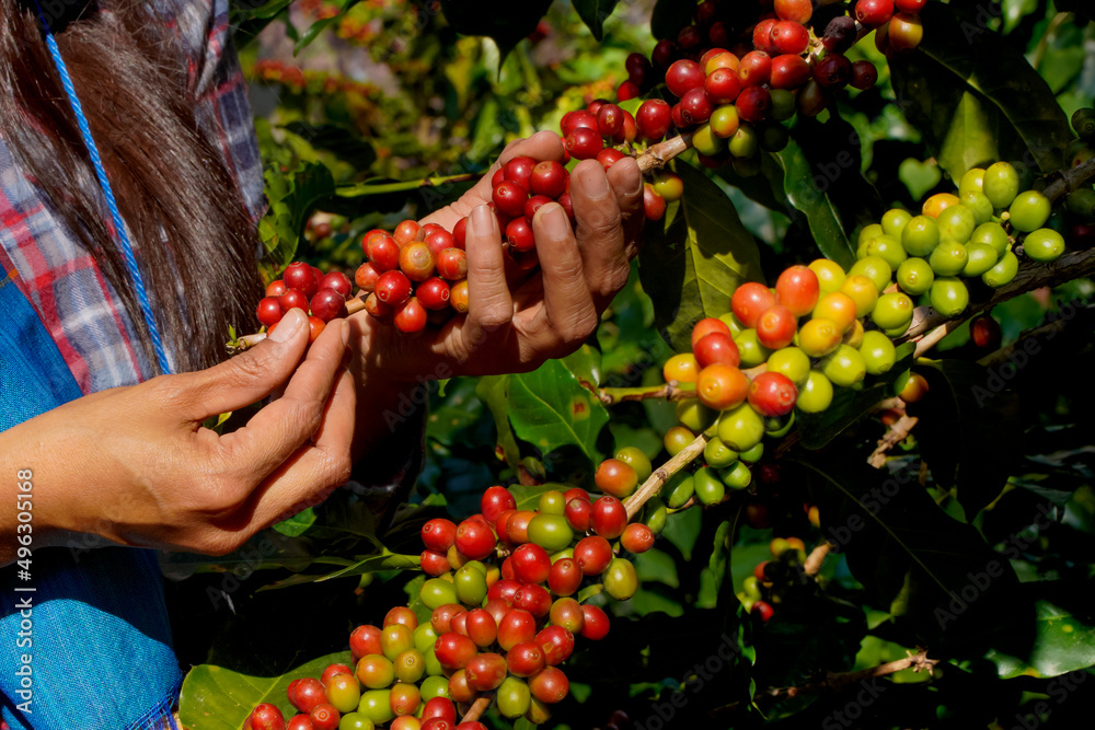 Raw or ripe Arabica and Robusta and organic coffee berries beans with agriculturist hands. Farmer crop fruit at farm in Java.
