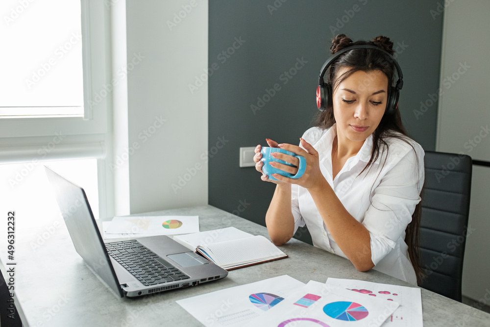Young woman works using laptop, headphones and paper reports. Blue cup with milk coffee.