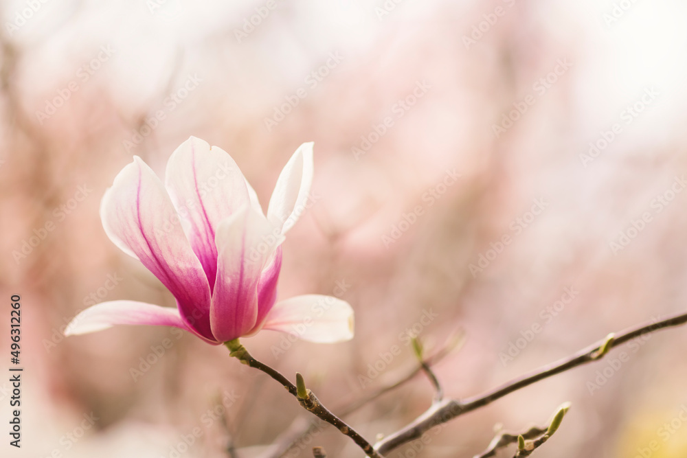 Magnolia tree blossom in spring, soft blurred background with sunshine