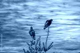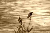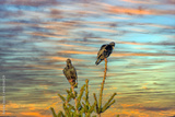 Two wood thrushes are sitting on the top of a fir tree in the rays of the setting sun close-up
