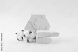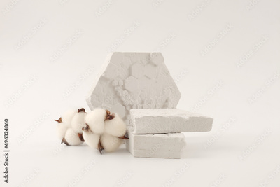 Empty texture stone platform eco podium and cotton flower gray beige copy space background. Minimal still life display product presentation scene.