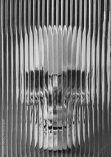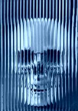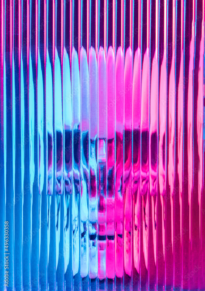 Neon illuminated human skull behind blurred glass with lines. Spooky, cyber Halloween background.