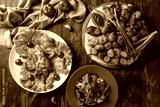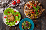 platter of different kebabs, chicken tabacco and greek salad top view on dark wooden table
