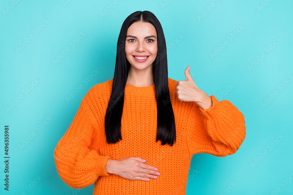 Photo of sweet adorable woman wear orange sweater arm stomach thumb up isolated turquoise color background